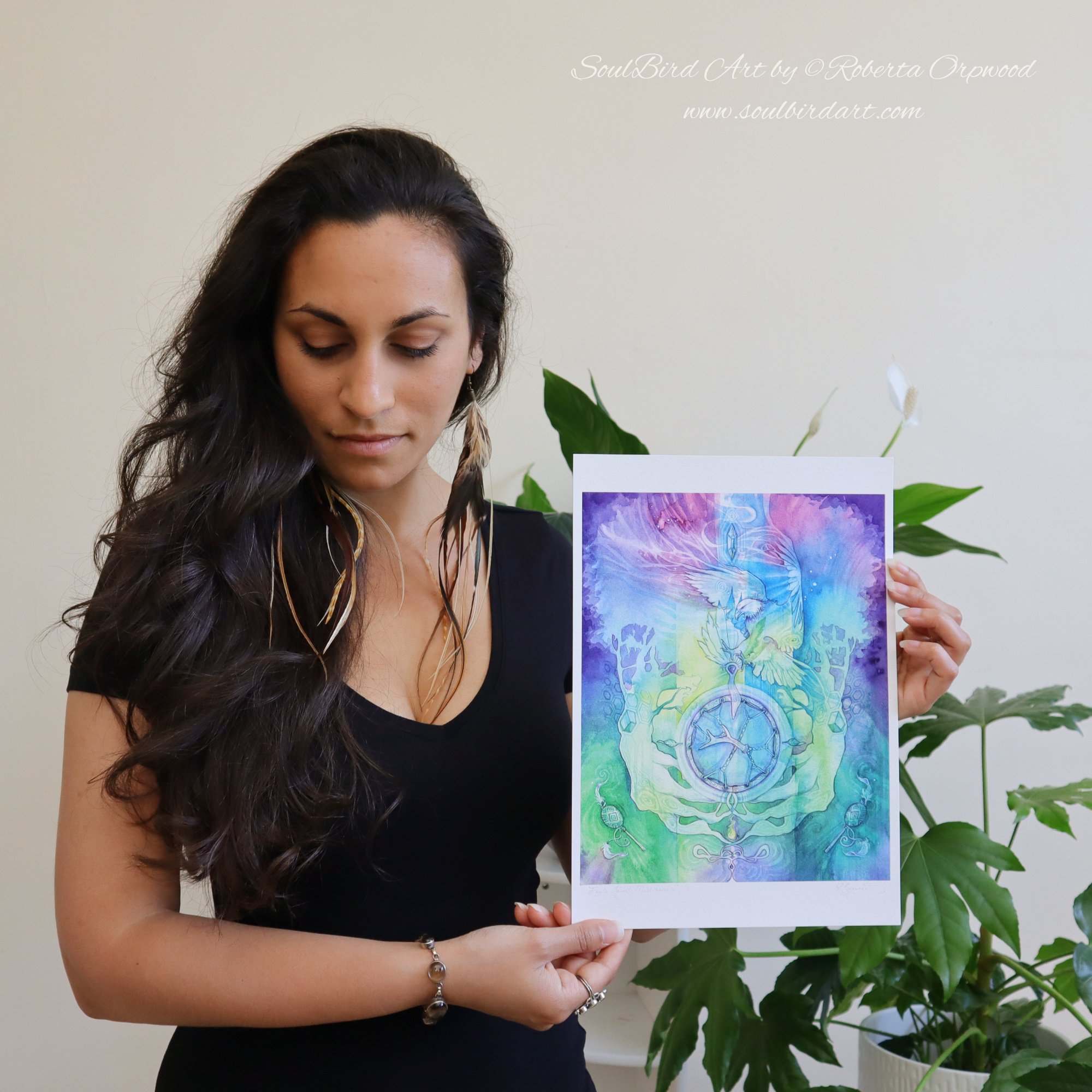 Spirit Eagle rises on unseen currents, wings outstretched against the vast sky, carrying the wisdom of higher vision. In this shamanic painting, she soars alongside the Tree of Life, the great axis that roots earth to heaven and bridges these sacred realms as one. From this elevated vantage, the wider pattern becomes clear.