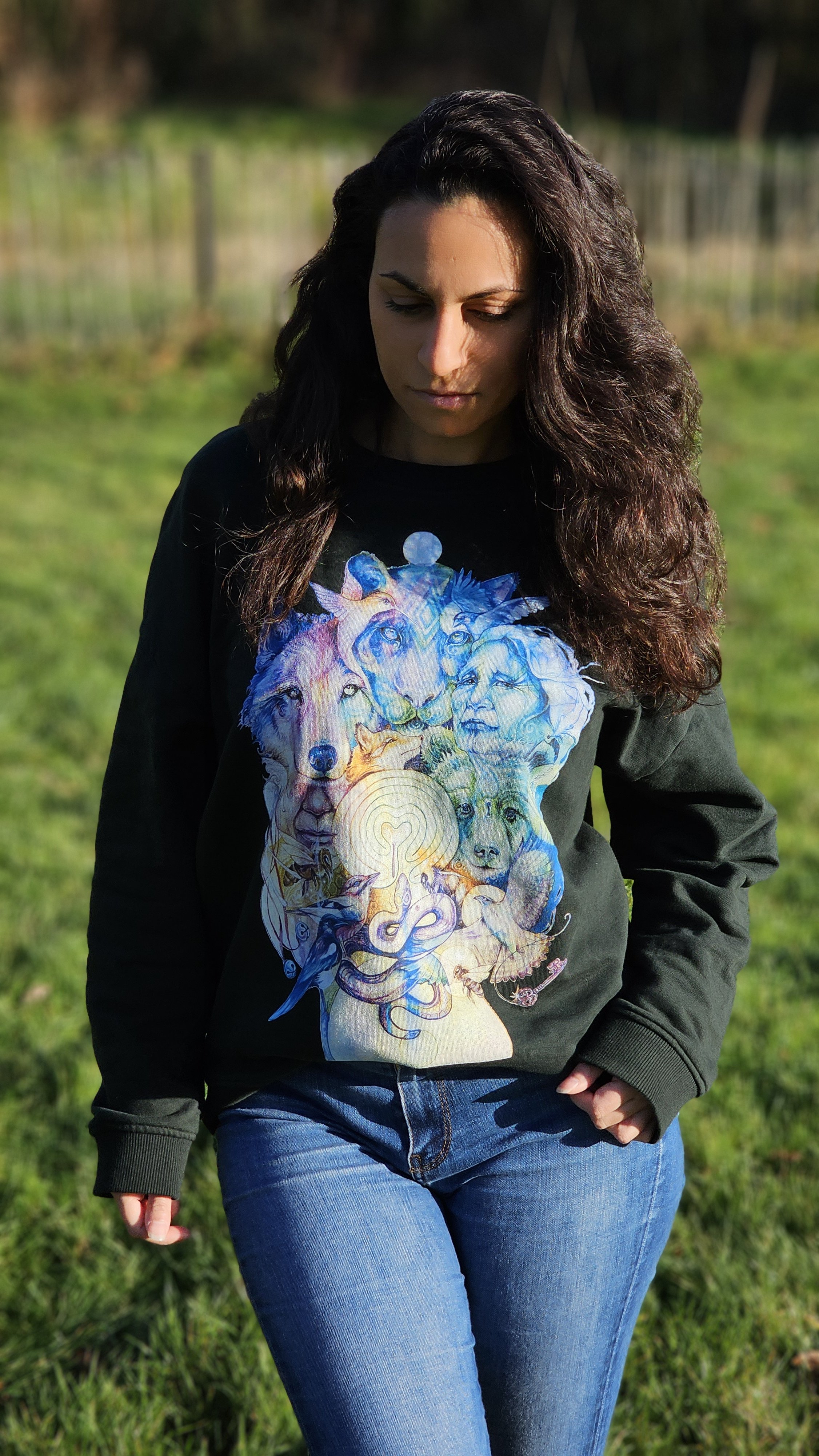 Printed on certified organic cotton, this wearable Sacred Art blends conscious comfort with profound meaning. Ideal for seekers looking to enhance their bond with their Power Animal or infuse their daily journey with spiritual resonance, Path of the Heart is not just a sweater, it’s a talisman of love, guidance, and connection.