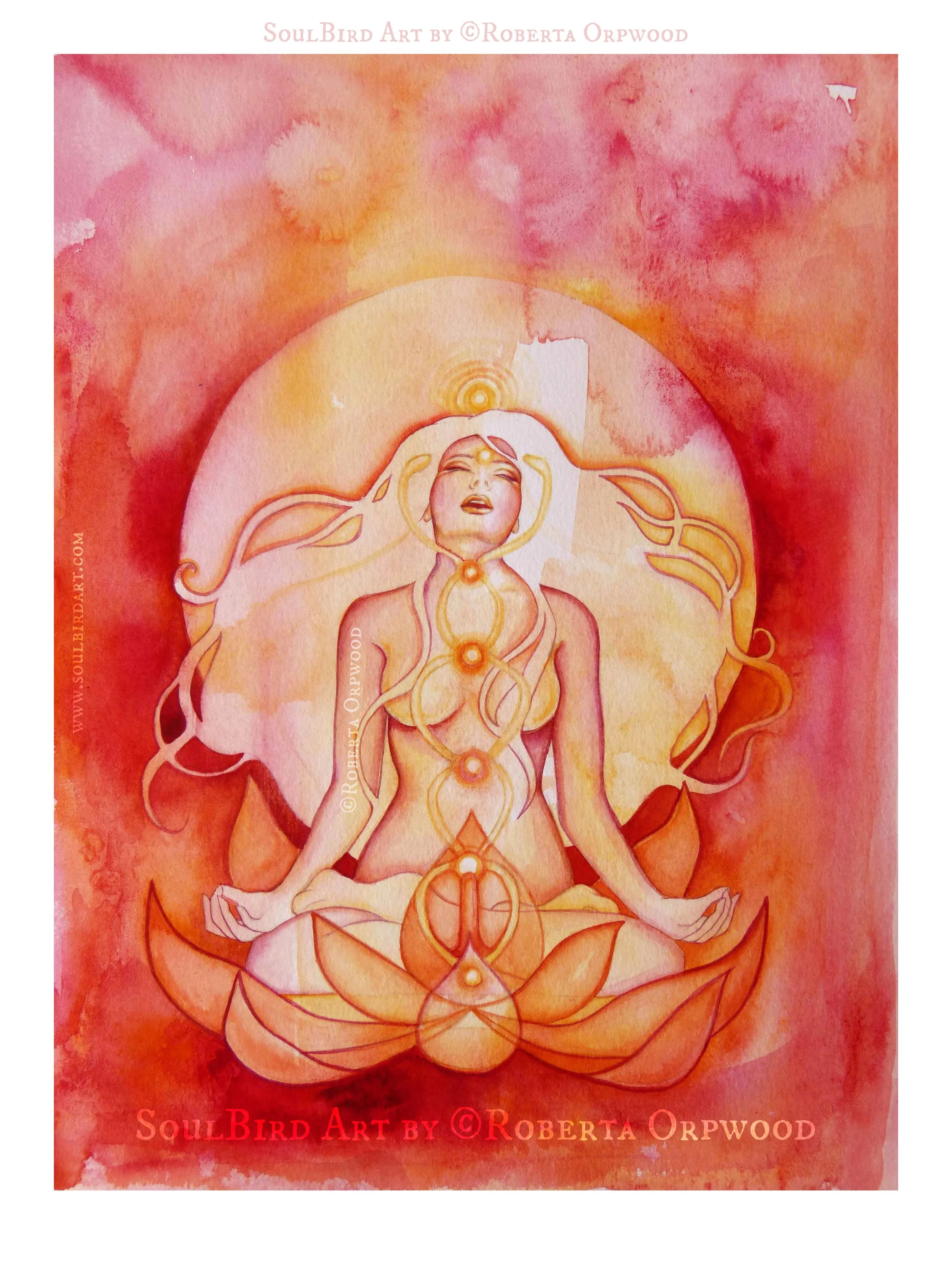 Seated in sacred stillness, she becomes the vessel of awakening. The serpent energy coils and ascends through her, luminous and alive, igniting each centre with ecstatic fire. This is the rising of Kundalini, the primal life force stirring from the root, awakening consciousness and expanding awareness beyond limitation.