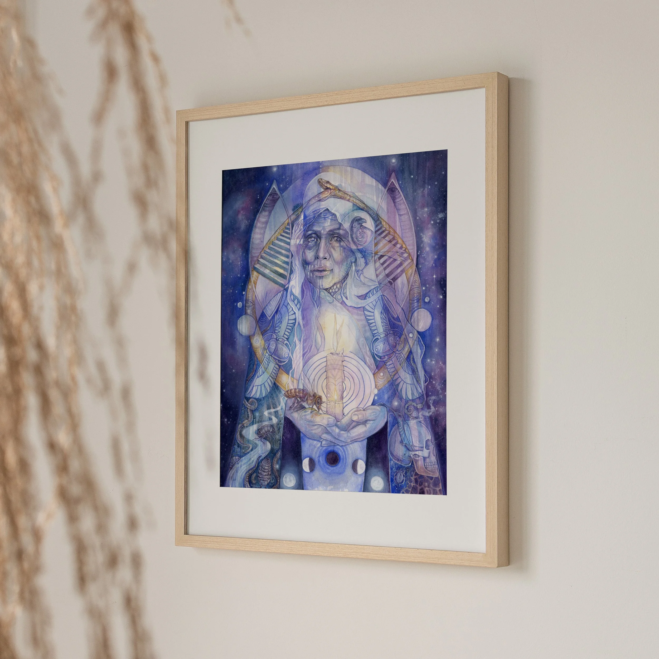 Her paintings act as gateways for healing, awakening the spirit through colour, ceremony, and mythic symbolism. Rooted in Shamanic living and spiritual devotion, her artwork bridges the visible and invisible worlds, offering sacred mirrors of transformation and remembrance.