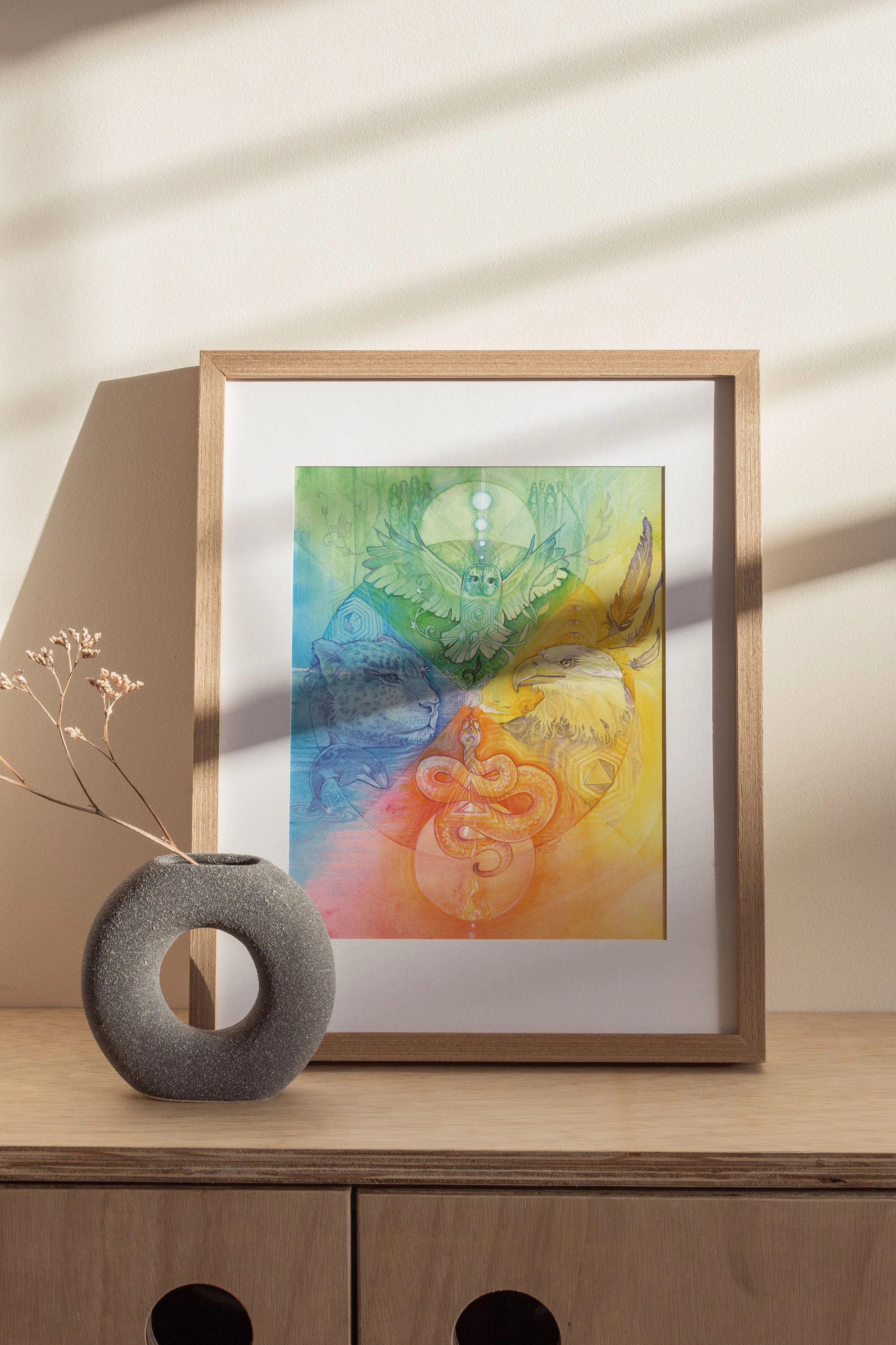 This painting is a prayer to walk in right relationship with the cycles of change, to honour the guardians of each quarter, and to remember that we stand always at the centre of a living, turning wheel of Life, propelled by the Love of Spirit.