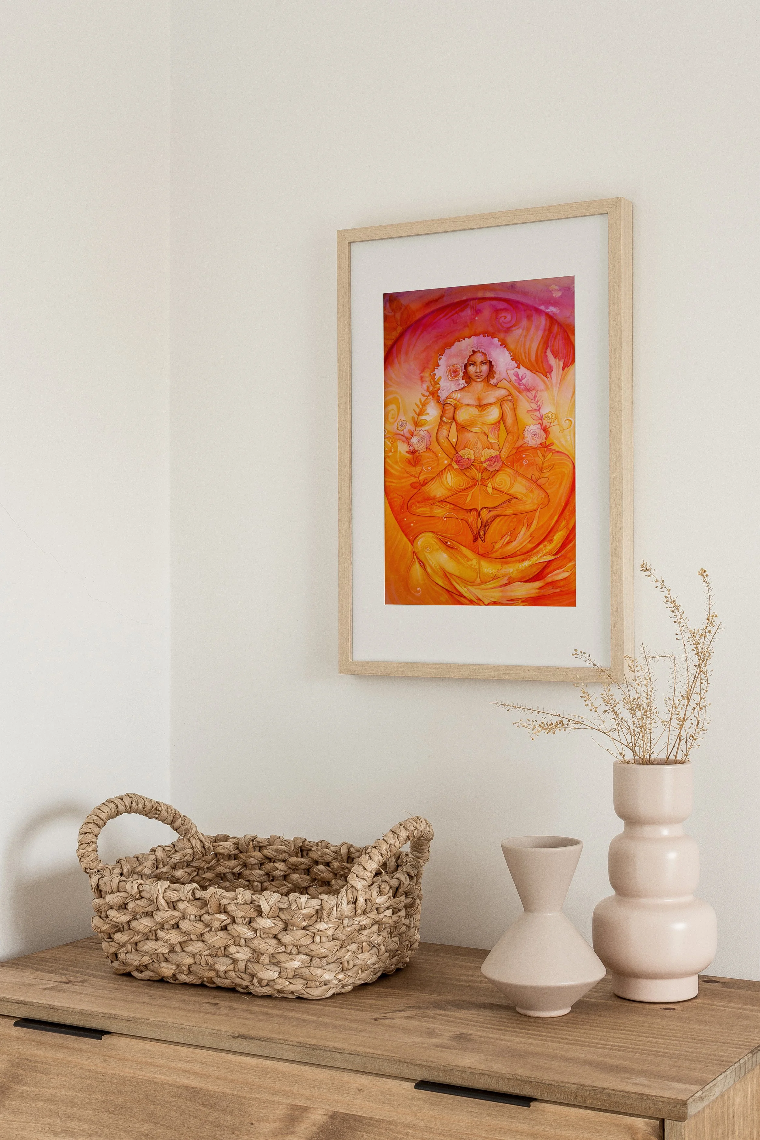 This painting honours the Sacral Chakra, the wellspring of emotion, creativity and sensual life force. Flowing like sacred waters through the body, this energy centre governs our capacity for pleasure, intimacy and authentic expression. When balanced, it restores our ability to feel deeply and create freely.